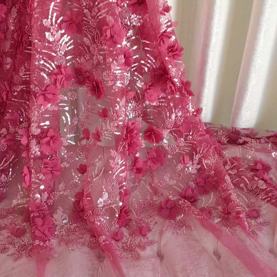 RENDA PARA VESTIDO DE CERIMÓNIA BORDADO COM LANJEJOULAS E FLORES 3D EM FORMA DE CRAVO.