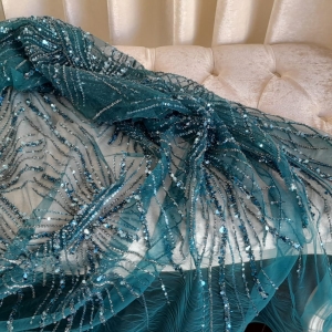 Renda para cerimónia cor petróleo bordada com pedraria. Estilo abstrato.