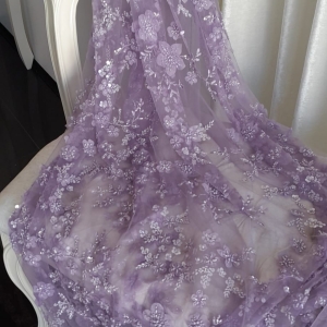 Renda para cerimónia cor salmão e liás. Estilo floral 3D e pedraria.