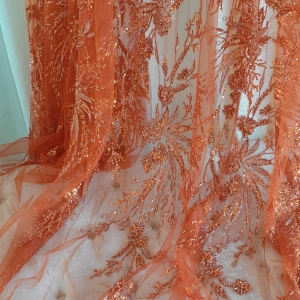 Renda para cerimónia cor terracota, bordada com pedraria. Estilo floral.