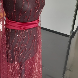 Renda para cerimónia cor bordeaux, bordada com pedraria.
