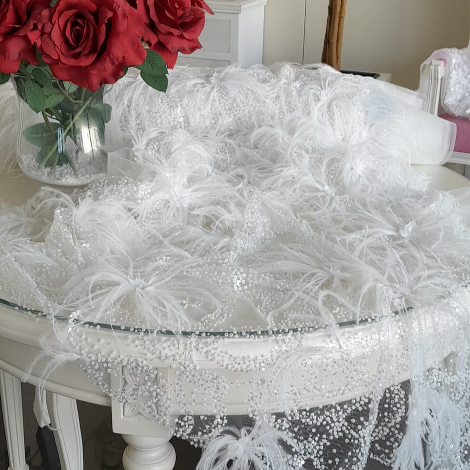 RENDA PARA VESTIDO DE NOIVA BORDADO COM PEDRARIA E PLUMAS EM FORMA DE FLOR.