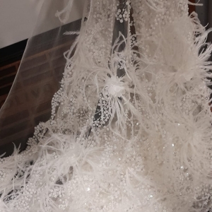 RENDA PARA VESTIDO DE NOIVA BORDADO COM PEDRARIA E PLUMAS EM FORMA DE FLOR.