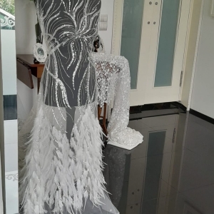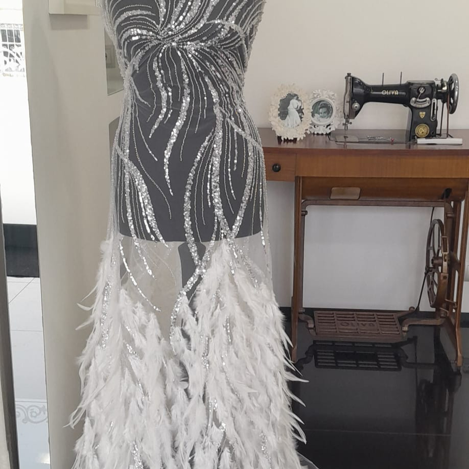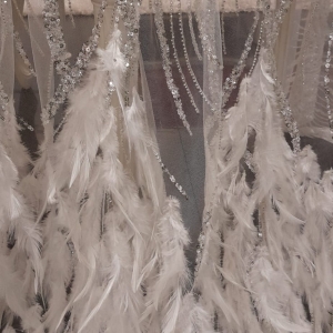 RENDA PARA VESTIDO DE NOIVA BORDADA COM PEDRARIA EM PRATA E BARRA DE PENAS.